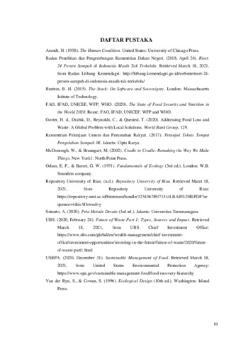 Kehidupan yang berjalan saat ini tidak bisa luput dari hubungan satu sama lain. Peran baik ataupun buruk akan menentukan dampak yang akan terjadi, atau biasa disebut hubungan timbal balik. Spesifiknya dalam ekologi dijelaskan adanya hubungan timbal balik antara manusia dengan lingkungannya. Konsep berhubungan ini erat dengan kondisi yang terus berkembang, seperti yang saat ini sedang terjadi yaitu pandemi COVID-19. Kehidupan kita terus berubah, dimana dalam pandemi ini semua hal dilakukan di rumah dan memanfaatkan e-commerce dalam memenuhi kebutuhan. Hal ini kemudian menimbulkan masalah baru yakni peningkatan sampah. Peningkatan ini sendiri terjadi karena pengolahan sampah yang belum terselesaikan dan minimnya kesadaran masyarakat untuk bertanggung jawab atas pembuangannya. Khususnya sampah makanan yang menduduki persentase tertinggi dan juga kontras dengan kenyataan bahwa 8.9% dari populasi dunia masih kelaparan. Dengan tujuan untuk menciptakan pengolahan sampah yang bertanggungjawab, maka diterapkan metode diagram layering (Sutanto, 2020) terkait analisis potensi, kebutuhan, tapak, dan aktifitas. Serta pembagian programnya di dasari oleh Food Recovery Hierarcy (USEPA, 2020) terkait reduce, reuse, dan recycle. Penerapan metode ini kemudian menghasilkan hybrid program berupa rekreasi dan pengolahan. Kolaborasi memperpanjang siklus hidup sampah dalam ruang kegiatan masyarakat memberikan kesempatan untuk berperan, mulai dari berkumpul, berdiskusi, mengolah, dan menanam. Hal ini juga dibanu dengan peran teknologi sebagai bagian daro perkembangan jaman. Kata kunci: ekologi; reduce; reuse; recycle; sampah makanan