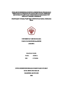 Jessica, Jessica (2022) PENGARUH MODERNISASI SISTEM ADMINISTRASI, PEMAHAMAN PERPAJAKAN, SANKSI DAN KUALITAS PELAYANAN TERHADAP KEPATUHAN WAJIB PAJAK UMKM DENGAN KESADARAN WP SEBAGAI VARIABEL MODERASI (Studi Empiris Terhadap Wajib Pajak UMKM di Kota Sambas, Kalimantan Barat). Masters thesis, UNIVERSITAS TARUMANAGARA.