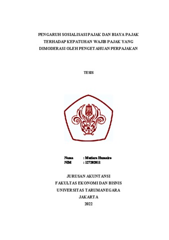 Humairo, Mutiara (2022) PENGARUH SOSIALISASI PAJAK DAN BIAYA PAJAK TERHADAP KEPATUHAN WAJIB PAJAK YANG DIMODERASI OLEH PENGETAHUAN PERPAJAKAN. Masters thesis, UNIVERSITAS TARUMANAGARA.
