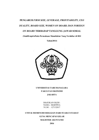 Martina, Martina (2016) PENGARUH FIRM SIZE, LEVERAGE, PROFITABILITY, CEO DUALITY, BOARD SIZE, WOMEN ON BOARD, DAN FOREIGN ON BOARD TERHADAP TANGGUNG JAWAB SOSIAL (StudiEmpirisPada Perusahaan Manufaktur Yang Terdaftar di BEI Tahun2014). Masters thesis, UNIVERSITAS TARUMANAGARA.