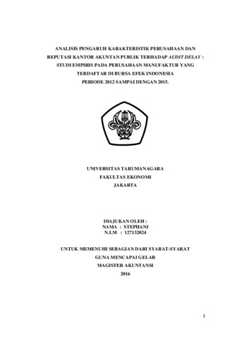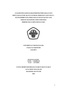 Stephani, Stephani (2016) ANALISIS PENGARUH KARAKTERISTIK PERUSAHAAN DAN REPUTASI KANTOR AKUNTAN PUBLIK TERHADAP AUDIT DELAY : STUDI EMPIRIS PADA PERUSAHAAN MANUFAKTUR YANG TERDAFTAR DI BURSA EFEK INDONESIA PERIODE 2012 SAMPAI DENGAN 2015. Masters thesis, UNIVERSITAS TARUMANAGARA.