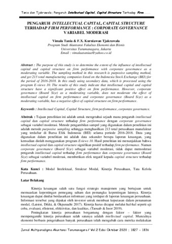 Fx.Kurniawan Tj, Dokumen (2020) Pengaruh Intellectual Capital, Capital Structure Terhadap Firm Performance : Corporate Governance Variabel Moderasi. Pengaruh Intellectual Capital, Capital Structure Terhadap Firm Performance : Corporate Governance Variabel Moderasi, 2 (3). ISSN 2657-0033