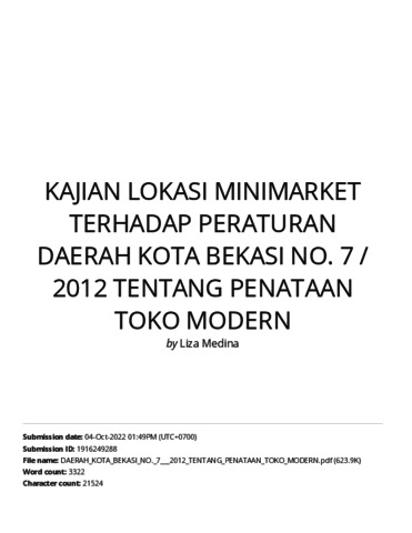 Perkembangan Minimarket (Convinience Store) di Kota Bekasi pesat demikian juga dengan lokasi yang tersebar di seluruh kelurahan di Wilayah Kota Bekasi, baik secara jenis waralaba, lokasi, dan waktu pelayanannya. Akibat dari perkembangan ini terjadinya Minimarket yang tidak mempunyai izin beroperasi dan terjadinya penyimpangan peraturan tentang kedekatan antar Minimarket, sehingga memberikan dampak positf maupun negative untuk lingkungan. Berdasarkan latarbelakang ini bertujuan untuk melakukan evaluasi peraturan daerah kota bekasi No. 7 tahun 2012. Untuk memperoleh itu, maka dilakukan analisis dengan menggunakan beberapa alat analisis seperti dekriptif, analisis tetangga terdekat (Nearest Neighbour Analysis).