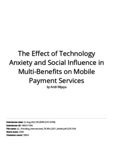 Andi wijaya, Dokumen (2021) The Effect of Technology Anxiety and Social Influence in Multi-Benefits on Mobile Payment Services. The Effect of Technology Anxiety and Social Influence in Multi-Benefits on Mobile Payment Services. ISSN ISSN 2352-5398 / ISBN 978-94-6239-567-1