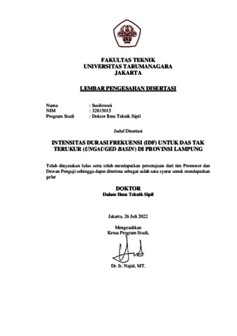 SUSILOWATI, SUSILOWATI (2022) INTENSITAS DURASI FREKUENSI (IDF) UNTUK DAS TAK TERUKUR (UNGAUGED BASIN) DI PROVINSI LAMPUNG. Doctoral thesis, Universitas Tarumanagara.