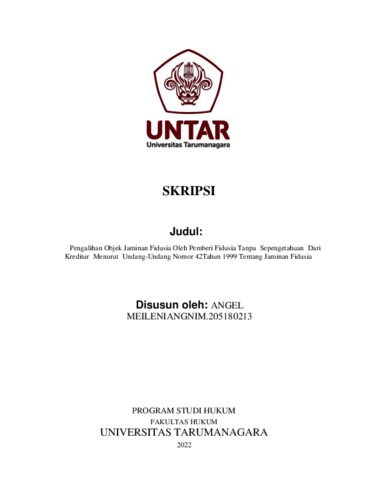 Meilenia Ng, Angel (2022) Pengalihan Objek Jaminan Fidusia Oleh Pemberi Fidusia Tanpa Sepengetahuan Dari Kreditur Menurut Undang-Undang Nomor 42 Tahun 1999 tentang Jaminan Fidusia. Skripsi thesis, Universitas Tarumanagara.