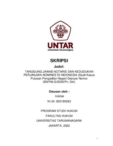 Ivana, Ivana (2022) Tanggung Jawab Notaris dan Kedudukan Perjanjian Nominee di Indonesia (Studi Kasus Putusan Pengadilan Negeri Gianyar Nomor 259/Pdt.G/2020/Pn. Gin). Skripsi thesis, Universitas Tarumanagara.