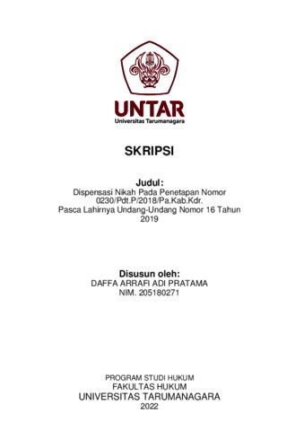 Pratama, Daffa Arrafi Adi (2022) Dispensasi Nikah Pada Penetapan Nomor 0230/Pdt.P/2018/PA.Kab.Kdr. Pasca Lahirnya Undang-Undang Nomor 16 Tahun 2019. Skripsi thesis, Universitas Tarumanagara.