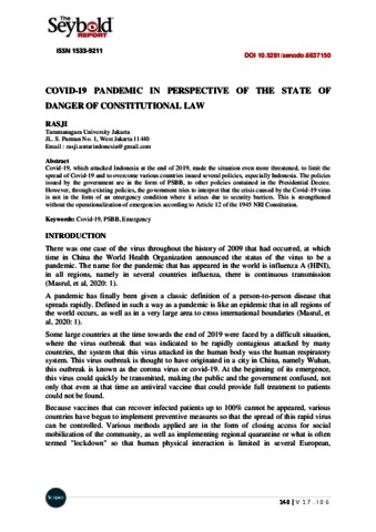 Rasji, Dokumen (2022) Covid-19 pandemic in perspective of the state of danger of constitutional law. Covid-19 pandemic in perspective of the state of danger of constitutional law, 17 (6). ISSN 1533-9211