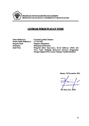 LIMANAN, CAECELIA CYNTHIA (2021) PENGARUH EFFORT EXPECTANCY, SOCIAL INFLUENCE, HABIT, DAN PRICE VALUE TERHADAP BEHAVIORAL INTENTION PENGGUNAAN DOMPET DIGITAL OVO: GENDER SEBAGAI VARIABEL MODERASI. Masters thesis, Universitas Tarumanagara.