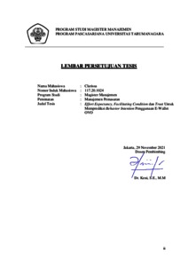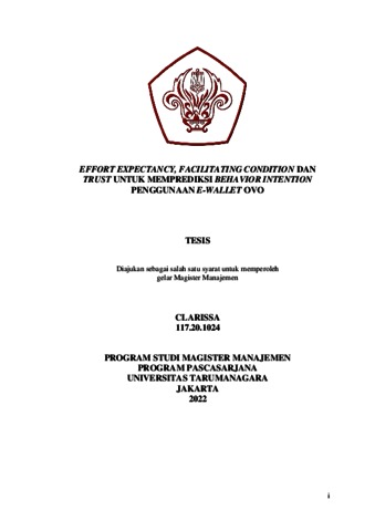 CLARISSA, CLARISSA (2021) EFFORT EXPECTANCY, FACILITATING CONDITION DAN TRUST UNTUK MEMPREDIKSI BEHAVIOR INTENTION PENGGUNAAN E-WALLET OVO. Masters thesis, Universitas Tarumanagara.