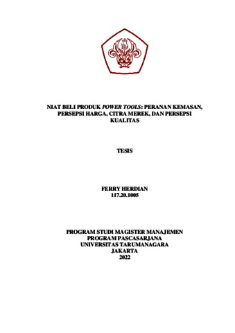 HERDIAN, FERRY (2021) NIAT BELI PRODUK POWER TOOLS: PERANAN KEMASAN, PERSEPSI HARGA, CITRA MEREK, DAN PERSEPSI KUALITAS. Masters thesis, Universitas Tarumanagara.