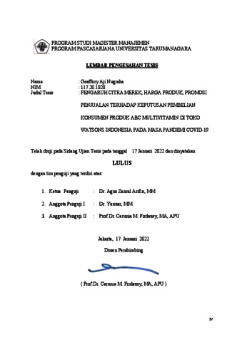 NUGRAHA, GEAFFARY AJI (2021) PENGARUH BRAND IMAGE, PRODUCT PRICE, SALES PROMOTION TERHADAP KEPUTUSAN PEMBELIAN KONSUMEN PRODUK ABC MULTIVITAMIN DI TOKO WATSONS INDONESIA PADA MASA PANDEMIC COVID-19. Masters thesis, Universitas Tarumanagara.