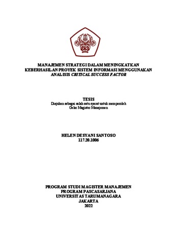SANTOSO, HELEN DESYANI (2021) MANAJEMEN STRATEGI DALAM MENINGKATKAN KEBERHASILAN PROYEK SISTEM INFORMASI MENGGUNAKAN ANALISIS CRITICAL SUCCESS FACTOR. Masters thesis, Universitas Tarumanagara.