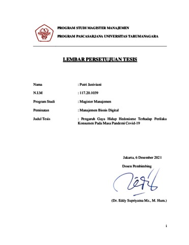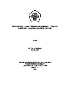 JANIVIANI, PUTRI (2021) PENGARUH GAYA HIDUP HEDONISME TERHADAP PERILAKU KONSUMEN PADA MASA PANDEMI COVID-19. Masters thesis, Universitas Tarumanagara.