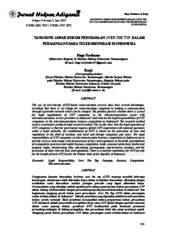 Hugo Prathama, Penulis 1 and Rasji, Penulis 2 (2022) TANGGUNG JAWAB HUKUM PERUSAHAAN OVER THE TOP DALAM PERSAINGAN USAHA TELEKOMUNIKASI DI INDONESIA. TANGGUNG JAWAB HUKUM PERUSAHAAN OVER THE TOP DALAM PERSAINGAN USAHA TELEKOMUNIKASI DI INDONESIA, 5 (1). pp. 254-278. ISSN 2655-7347, 2747-0873