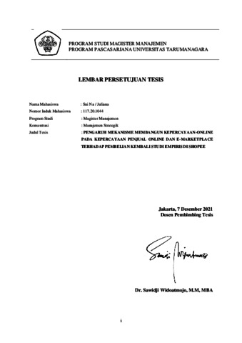 SUI NA, SUI NA (2021) PENGARUH MEKANISME MEMBANGUN KEPERCAYAAN-ONLINE PADA KEPERCAYAAN PENJUAL ONLINE DAN E-MARKETPLACE TERHADAP NIAT PEMBELIAN KEMBALI STUDI EMPIRIS DI SHOPEE. Masters thesis, Universitas Tarumanagara.