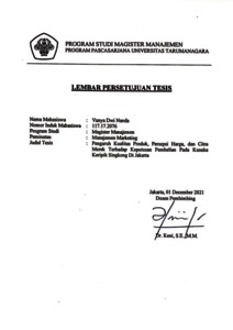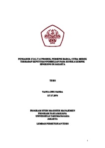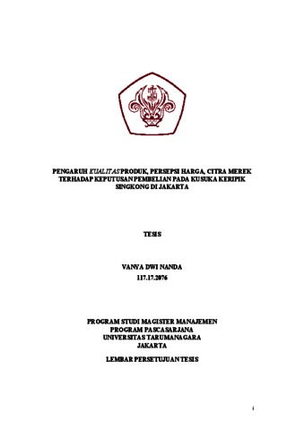 NANDA, VANYA DWI (2021) PENGARUH KUALITAS PRODUK, PERSEPSI HARGA, CITRA MEREK TERHADAP KEPUTUSAN PEMBELIAN PADA KUSUKA KERIPIK SINGKONG DI JAKARTA. Masters thesis, Universitas Tarumanagara.