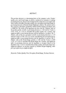 The purchase decision is a determining factor of the company’s sales. Product quality, price and brand image are factors considered by consumers in making purchasing decisions. Based on the background this study aims to test empirically and to analyze the effect of product quality, price perception and brand image on purchasing decisions of Kusuka Keripik Singkong in Jakarta. The method used in this research is descriptive quantitative method and the analytical technique used is SEM PLS. The results of the hypothesis test show that the T-Statistic value of the product quality variable on purchasing decisions is 2.363 and the P-value is 0.019 <0.05, so it can be concluded that product quality has a positive and significant effect on purchasing decisions and the hypothesis is accepted. The T-Statisticvalue of the price perception variable on purchasing decisions is 1.119 and the P-value is 0.264> 0.05, so it can be concluded the price perception has no