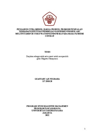 NUGRAHA, GEAFFARY AJI (2021) PENGARUH CITRA MEREK, HARGA PRODUK, PROMOSI PENJUALAN TERHADAP KEPUTUSAN PEMBELIAN KONSUMEN PRODUK ABC MULTIVITAMIN DI TOKO WATSONS INDONESIA PADA MASA PANDEMI COVID-19. Masters thesis, Universitas Tarumanagara.