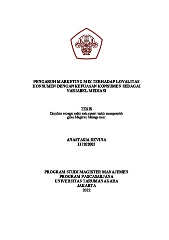 DEVINA, ANASTASIA (2021) PENGARUH MARKETING MIX TERHADAP LOYALITAS KONSUMEN DENGAN KEPUASAN KONSUMEN SEBAGAI VARIABEL MEDIASI. Masters thesis, Universitas Tarumanagara.