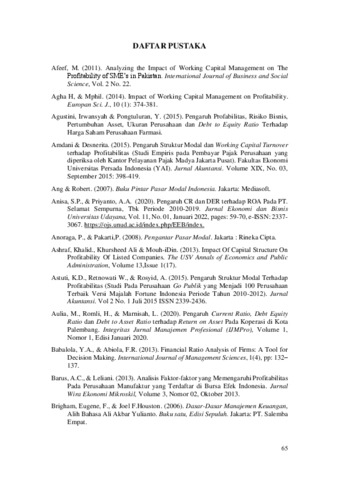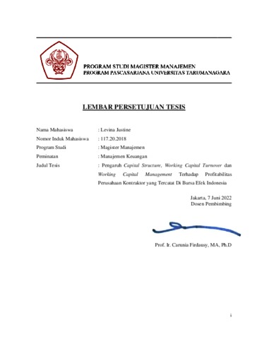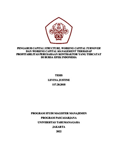 JUSTINE, LEVINA (2021) PENGARUH CAPITAL STRUCTURE, WORKING CAPITAL TURNOVER DAN WORKING CAPITAL MANAGEMENT TERHADAP PROFITABILITAS PERUSAHAAN KONTRAKTOR YANG TERCATAT DI BURSA EFEK INDONESIA. Masters thesis, Universitas Tarumanagara.
