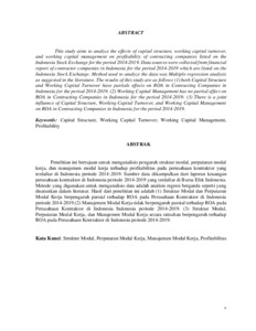 This study aims to analyze the effects of capital structure, working capital turnover, and working capital management on profitability of contracting companies listed on the Indonesia Stock Exchange for the period 2014-2019. Data sources were collected from financial report of contractor companies in Indonesia for the period 2014-2019 which are listed on the Indonesia Stock Exchange. Method used to analyze the data was Multiple regression analysis as suggested in the literature. The results of this study are as follows (1) both Capital Structure and Working Capital Turnover have partials effects on ROA in Contracting Companies in Indonesia for the period 2014-2019. (2) Working Capital Management has no partial effect on ROA in Contracting Companies in Indonesia for the period 2014-2019. (3) There is a joint influence of Capital Structure, Working Capital Turnover, and Working Capital Management on ROA in Contracting Companies in Indonesia for the period 2014-2019.