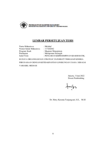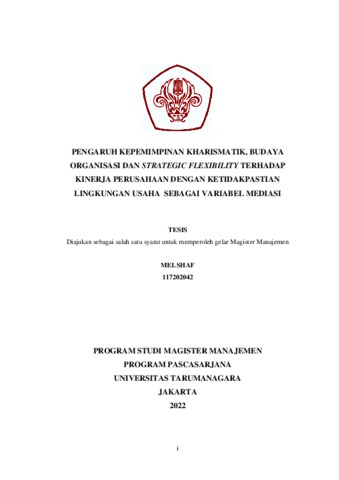 MELSHAF, MELSHAF (2021) PENGARUH KEPEMIMPINAN KHARISMATIK, BUDAYA ORGANISASI DAN STRATEGIC FLEXIBILITY TERHADAP KINERJA PERUSAHAAN DENGAN KETIDAKPASTIAN LINGKUNGAN USAHA SEBAGAI VARIABEL MEDIASI. Masters thesis, Universitas Tarumanagara.