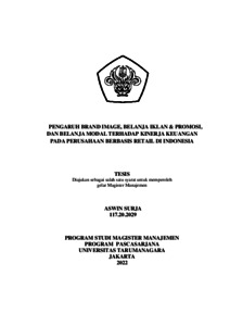 SURJA, ASWIN (2022) PENGARUH BRAND IMAGE, BELANJA IKLAN & PROMOSI, DAN BELANJA MODAL TERHADAP KINERJA KEUANGAN PADA PERUSAHAAN BERBASIS RETAIL DI INDONESIA. Masters thesis, Universitas Tarumanagara.