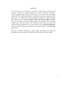 multiple linear regression analysis. The conclusion of this study shows that brand image and capital expenditure have a positive impact to firm’s financial performance while advertising and promotion spending have a negative impact to firm’s financial performance.