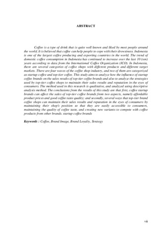years according to data from the International Coffee Organization (ICO). In Indonesia, there are several categories of coffee shops with different products and different target markets. There are four waves of the coffee shop industry, and two of them are categorized as startup coffee and top-tier coffee. This study aims to analyze how the influence of startup coffee brands on the sales results of top-tier coffee brands and also to analyze the strategies