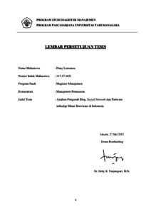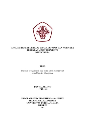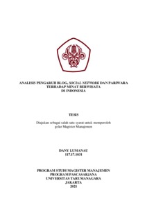 LUMANAU, DANY (2020) ANALISIS PENGARUH BLOG, SOCIAL NETWORK DAN PARIWARA TERHADAP MINAT BERWISATA DI INDONESIA. Masters thesis, Universitas Tarumanagara.