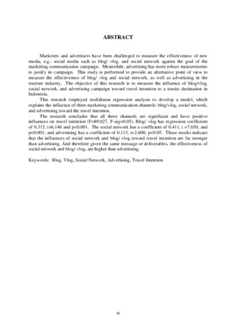 measure the effectiveness of blog/ vlog and social network, as well as advertising in the tourism industry. The objective of this research is to measure the influence of blog/vlog, social network, and advertising campaign toward travel intention to a tourist destination in Indonesia.