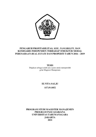 SALJU, ELVITA (2020) PENGARUH PROFITABILITAS, SIZE, TANGIBILITY, DAN KOMISARIS INDEPENDEN TERHADAP STRUKTUR MODAL PERUSAHAAN REAL ESTATE DAN PROPERTI TAHUN 2016 – 2019. Masters thesis, Universitas Tarumanagara.