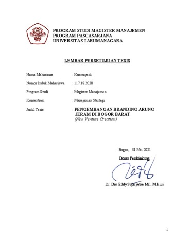 KUSMAYADI, KUSMAYADI (2020) PENGEMBANGAN BRANDING ARUNG JERAM DI BOGOR BARAT (New Venture Creation). Masters thesis, Universitas Tarumanagara.