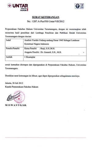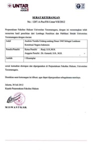 Rasji, Penulis Pertama and Gunardi, penulis Kedua (2012) Analisis Yuridis Undang-undang Dasar 1945 Sebagai Landasan Konstitusi Negara Indonesia. Analisis Yuridis Undang-undang Dasar 1945 Sebagai Landasan Konstitusi Negara Indonesia, - (-). pp. 1-120. ISSN -
