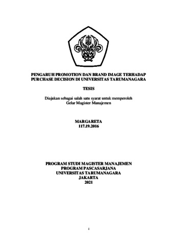 MARGARETA, MARGARETA (2020) PENGARUH PROMOTION DAN BRAND IMAGE TERHADAP PURCHASE DECISION DI UNIVERSITAS TARUMANAGARA. Masters thesis, Universitas Tarumanagara.