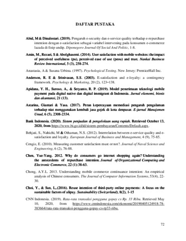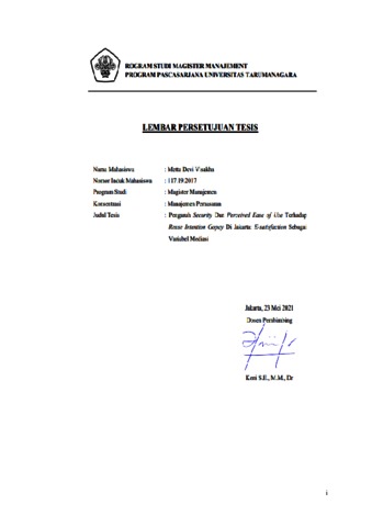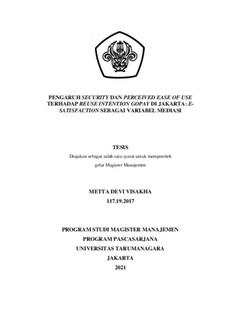 VISAKHA, METTA DEVI (2020) PENGARUH SECURITY DAN PERCEIVED EASE OF USE TERHADAP REUSE INTENTION GOPAY DI JAKARTA: ESATISFACTION SEBAGAI VARIABEL MEDIASI. Masters thesis, Universitas Tarumanagara.