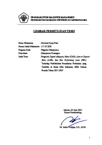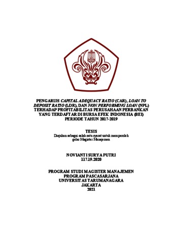 PUTRI, NOVIANTI SURYA (2020) PENGARUH CAPITAL ADEQUACY RATIO (CAR), LOAN TO DEPOSIT RATIO (LDR), DAN NON PERFORMING LOAN (NPL) TERHADAP PROFITABILITAS PERUSAHAAN PERBANKAN YANG TERDAFTAR DI BURSA EFEK INDONESIA (BEI) PERIODE TAHUN 2017-2019. Masters thesis, Universitas Tarumanagara.