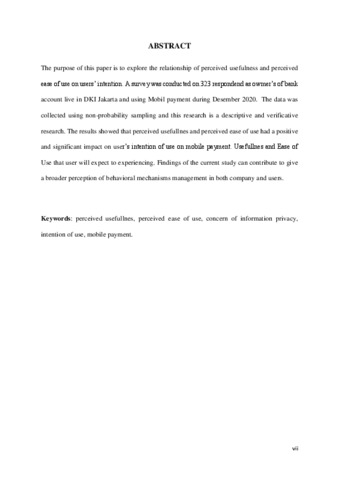 Keywords: Perceived usefullnes, perceived ease of use, concern of information privacy, intention of use, mobile payment