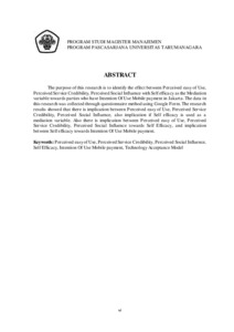 Keywords: Perceived easy of Use, Perceived Service Credibility, Perceived Social Influence, Self Efficacy, Intention Of Use Mobile payment, Technology Acceptance Model