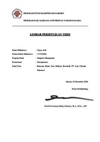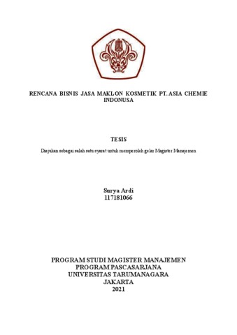 ARDI, SURYA (2020) RENCANA BISNIS JASA MAKLON KOSMETIK PT. ASIA CHEMIE INDONUSA. Masters thesis, Universitas Tarumanagara.