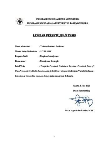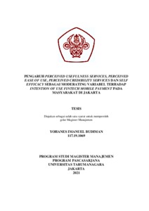BUDIMAN, YOHANES IMANUEL (2020) PENGARUH PERCEIVED USEFULNESS SERVICES, PERCEIVED EASE OF USE, PERCEIVED CREDIBILITY SERVICES DAN SELF EFFICACY SEBAGAI MODERATING VARIABEL TERHADAP INTENTION OF USE FINTECH MOBILE PAYMENT PADA MASYARAKAT DI JAKARTA. Masters thesis, Universitas Tarumanagara.