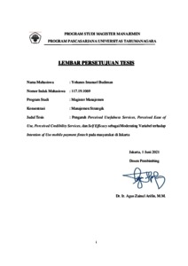 use, perceived credibility services and self efficacy on intention of use, also there is an effect of perceived ease of use on intention of use moderated by self efficacy. But there is not an effect of perceived usefulness services and perceived credibility services on intention of use moderated by self efficacy. This study provides input for the mobile payment companies and community so that public interest can be increase in using mobile payment technology. Digital payment based company need to understand the factors that help user to intention of use mobile payment, so they will focus more on the factors that need to be considered by the