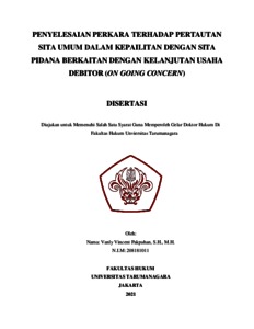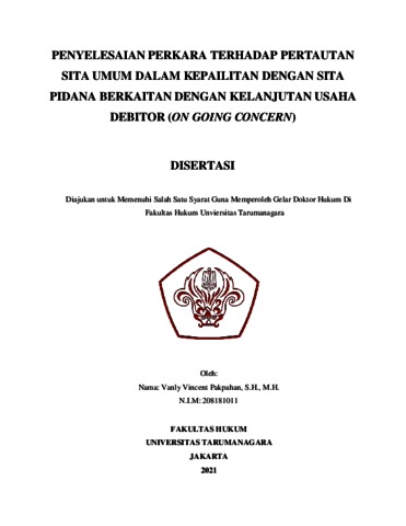Pakpahan, Vanly Vincent (2022) Penyelesaian Perkara Terhadap Pertautan Sita Umum Dalam Kepailitan Dengan Sita Pidana Berkaitan Dengan Kelanjutan Usaha Debitor (On Going Concern). Doctoral thesis, Universitas Tarumanagara.