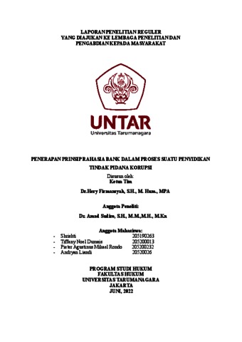 Firmansyah, Hery and Sudiro, Amad and Shrishti, Shrishti and Dumais, Tiffany Noel and Rondo, Pieter Agustinus Mikael and Liandi, Andryan (2022) Penerapan Prinsip Rahasia Bank Dalam Proses Suatu Penyidikan Tindak Pidana Korupsi. Laporan Penelitian.