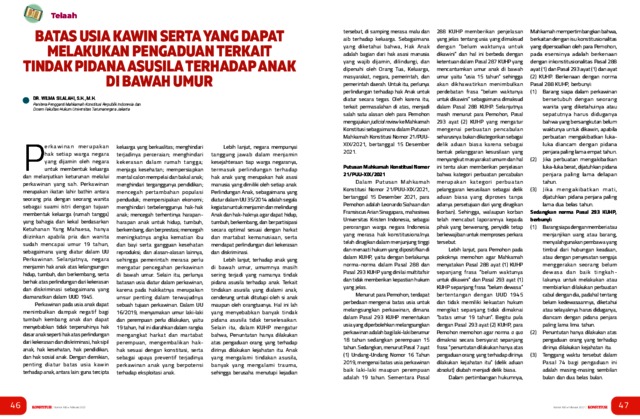 Silalahi, Wilma (2022) Batas Usia Kawin Serta Yang Dapat Melakukan Pengaduan Terkait Tindak Pidana Asusila Terhadap Anak di Bawah Umur. Majalah Konstitusi.