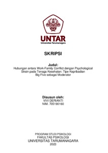Derianti, Vivi (2023) Hubungan Work-Family Conflict dengan Psychological Strain pada Tenaga Kesehatan: Tipe Kepribadian Big Five sebagai Moderator. Skripsi thesis, Universitas Tarumanagara.