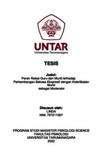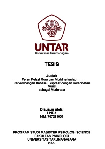 Linda, Linda (2023) Peran Relasi Guru dan Murid terhadap Perkembangan Bahasa Ekspresif dengan Keterlibatan Murid sebagai Moderator. Masters thesis, Universitas Tarumanagara.