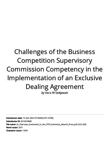 Challenges of the Business Competition Supervisory Commission Competency in the Implementation of an Exclusive Dealing Agreement(original).pdf Download (930kB) | Preview |